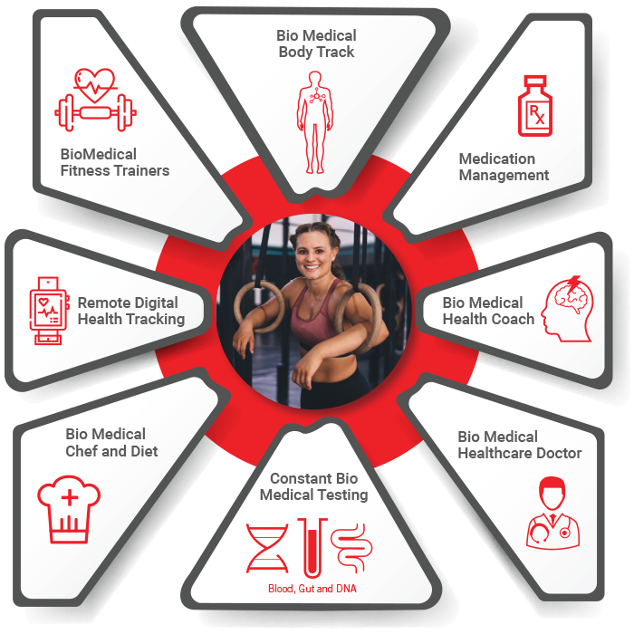 • Advanced Biomedical Monitoring – Track and testing of biomarkers in blood, gut, and DNA for proactive care and prevention of health issues.